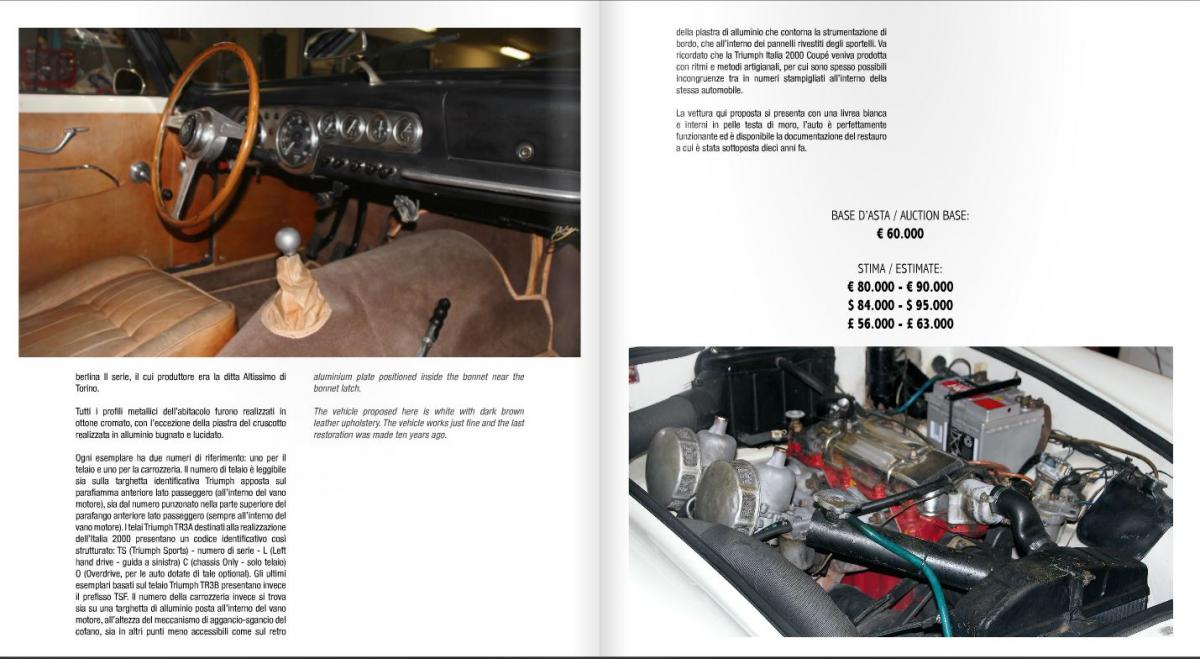Another rare opportunity to buy a Triumph Italia, this time at auction: http://www.oldtimergalerie.ch/e/auction/Juni2014.htm June 7th in Switzerland. Further details to follow on this car