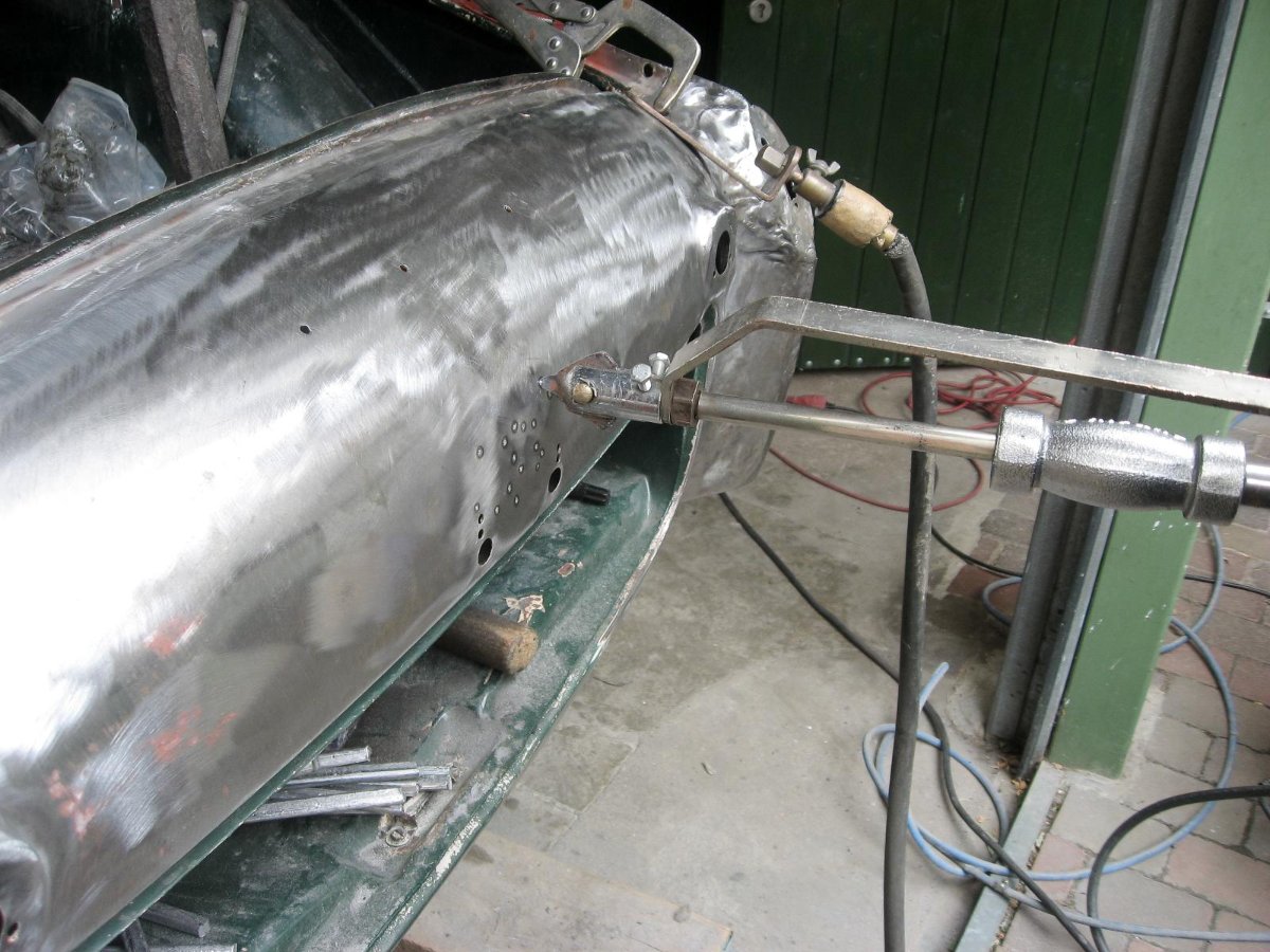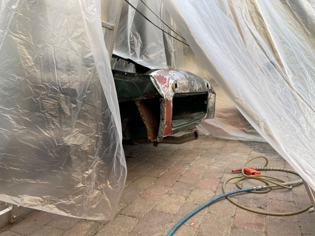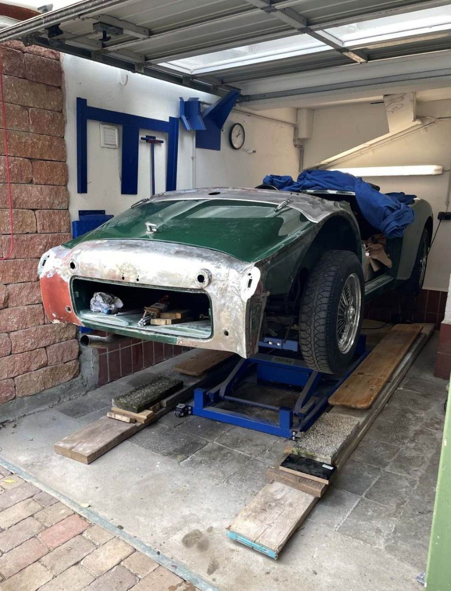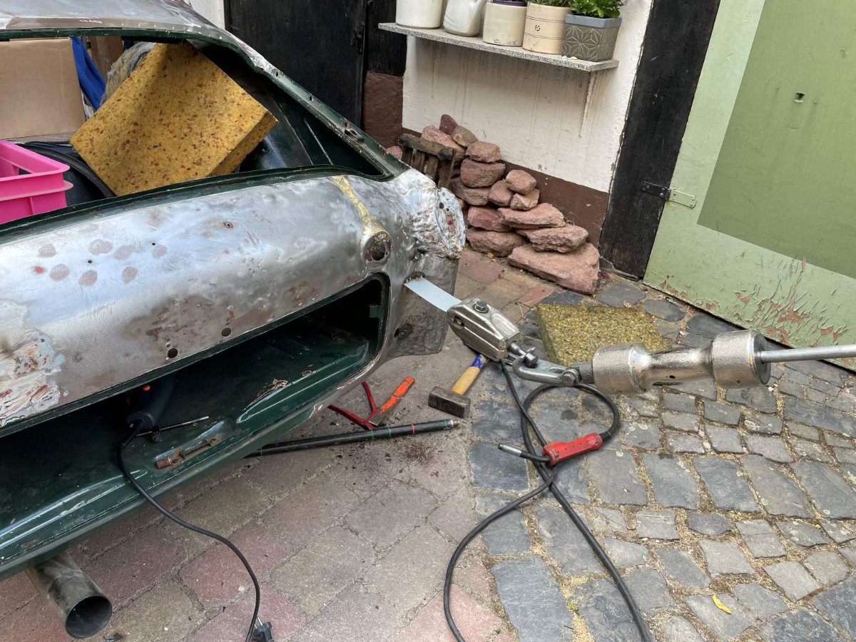 Speedy Posted December 29, 2024 Author Report Posted December 29, 2024 What did I write above: “The rear looks pretty good”. We suspected there was a lot of filler on the right rear, which unfortunately turned out to be true after removing the paint. It must have taken a good hit on the back. We have now brought our masterpiece home from the workshop (due to space and time) and we are continuing step by step. Always looking for surprises. The cavities were opened, blasted, treated against rust and closed again. Improvised sand blasting cabin. And pounds of american Bondo. It takes dozens of hours, to get the rear end back into shape. Very frustrating at times and then happy again when I see the result. All special tools were procured or borrowed to achieve the best possible result. Here is a spotter in action. Do you know how expensive bodywork tin is these days? My motorbike lift has been converted into a wonderful TR lift Quote