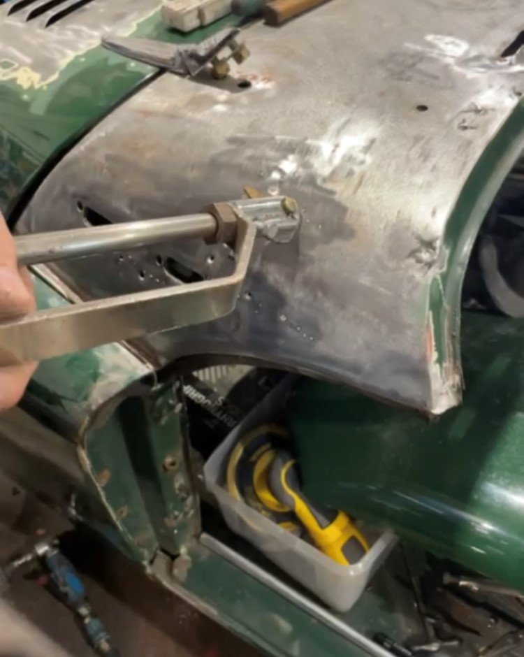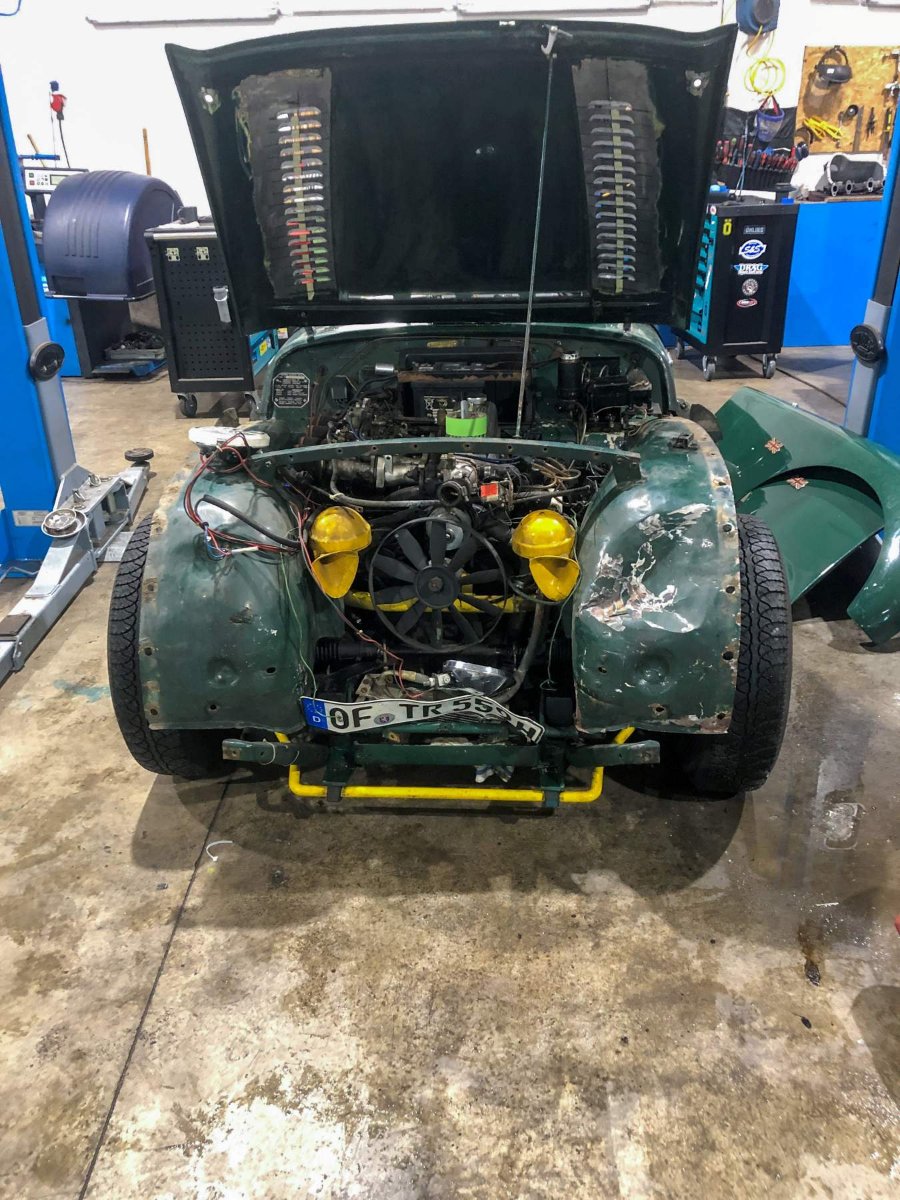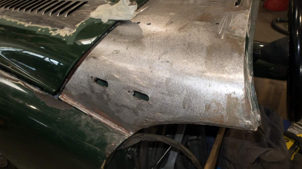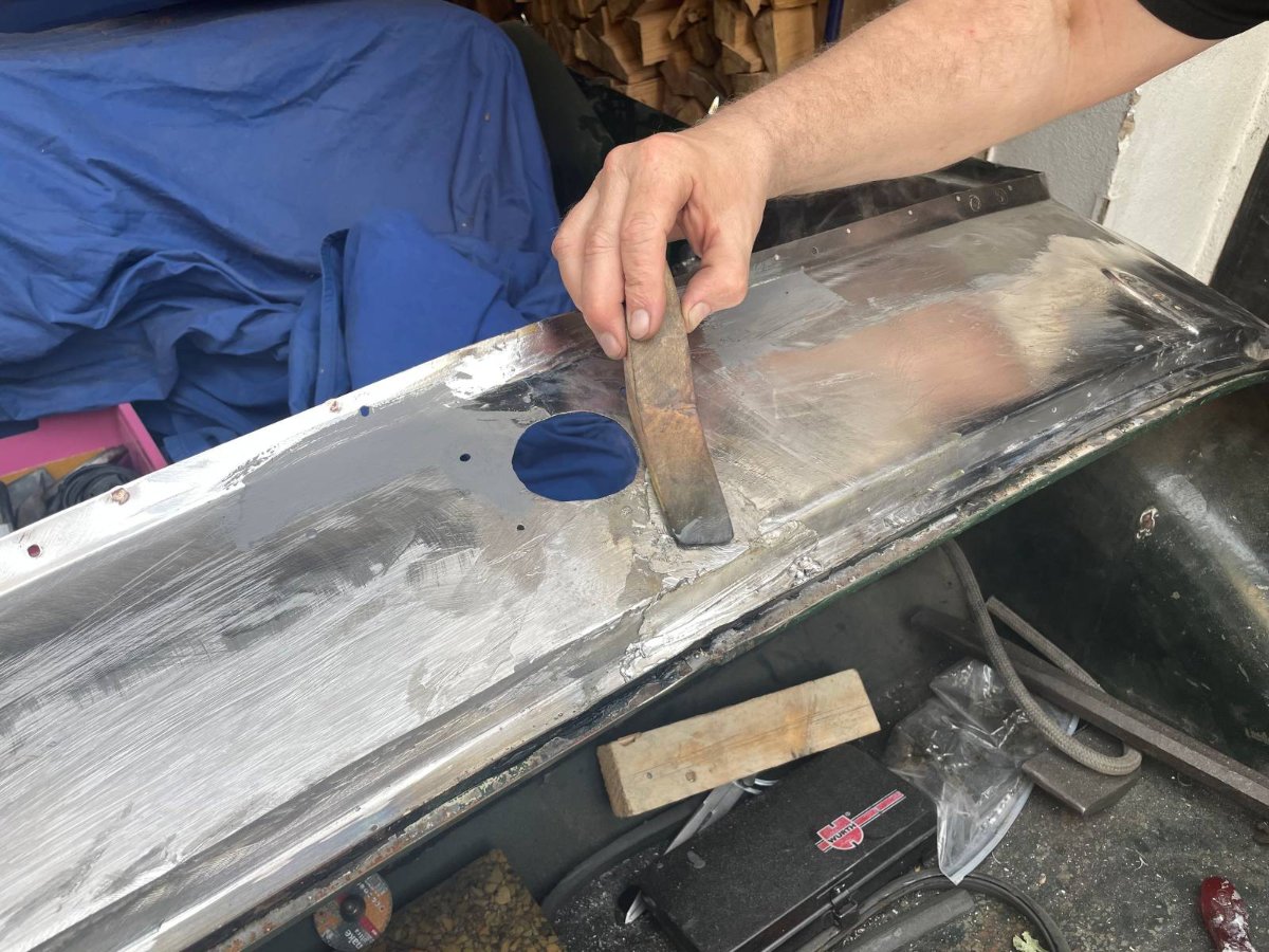 Speedy Posted December 29, 2024 Author Report Posted December 29, 2024 (edited) Such an accident is of course always very annoying, but the first inspecition at least did not reveal a catastrophe. It remained just a sheet metal damage, here is the first line-up: • Front Apron ruined and not salvageable • The grille also scrap • Headlight broken (unfortunately the good Lucas - no longer available) • Lamp rim broken • TR3 emblem bent • Fender dented but salvageable • Inner fender ditto • Oil cooler broken • Water radiator bent and leaking • Kenlowe fan broken • Hella fog light broken The expert prepared a damage report = economic total loss!!! That surprised me and even more so the amount of damage determined: estimated repair costs around 32,000€. For us, however, the question of not repairing the TR never arose, especially since the frame was not damaged. Since our TR has now become a generational car and son Colin has been tinkering with it for years - and drives it himself - the project is being carried out by both of us, especially because he has an excellent background and network. We want to build the car the way we have been wanting it for a long time. We were able to take our time with the planning, especially since not much has happened in terms of insurance. The lawsuit is ongoing. The most important part for reconstruction was already purchased one day after the accident. Colin was able to buy a used original front apron in very good condition for little money in the classifieds. Unfortunately, we only realised months later that this was not so good. We had the radiator refurbished in a specialist workshop, and a high-performance mesh was fitted. The bonnet had hardly any damage, but we wanted always Louvers which are embossed in a specialized company. The TR is now in the workshop (it's shortly before Christmas 2022) and the body fitter is starting the work. As the whole bodywork is being checked or reworked, let's take a look at the rear. It looks OK so far. We thought the same about the scuttle panel. A few small cracks had formed in the paint over the decades and these now had to be addressed. We noticed that quite a lot of filler had been applied in various places. That was from the Americans. My painter, who painted the TR in 1986, didn't bother with it either (it has held up until now). After removing the paint and filler, this was what came to light: And not only on the right side it looked like this, but also on the left side. That looks better now. Edited January 6 by Speedy Quote