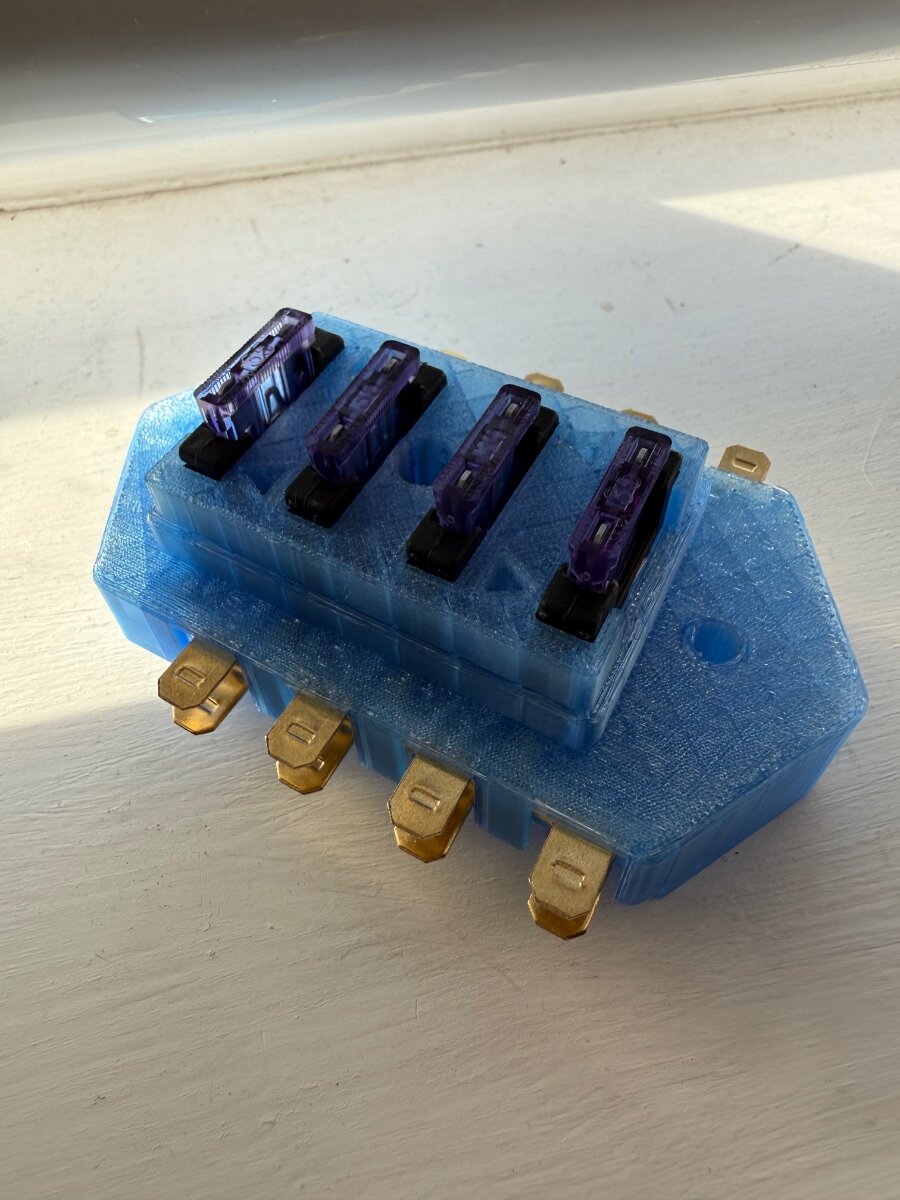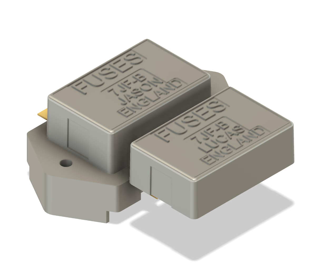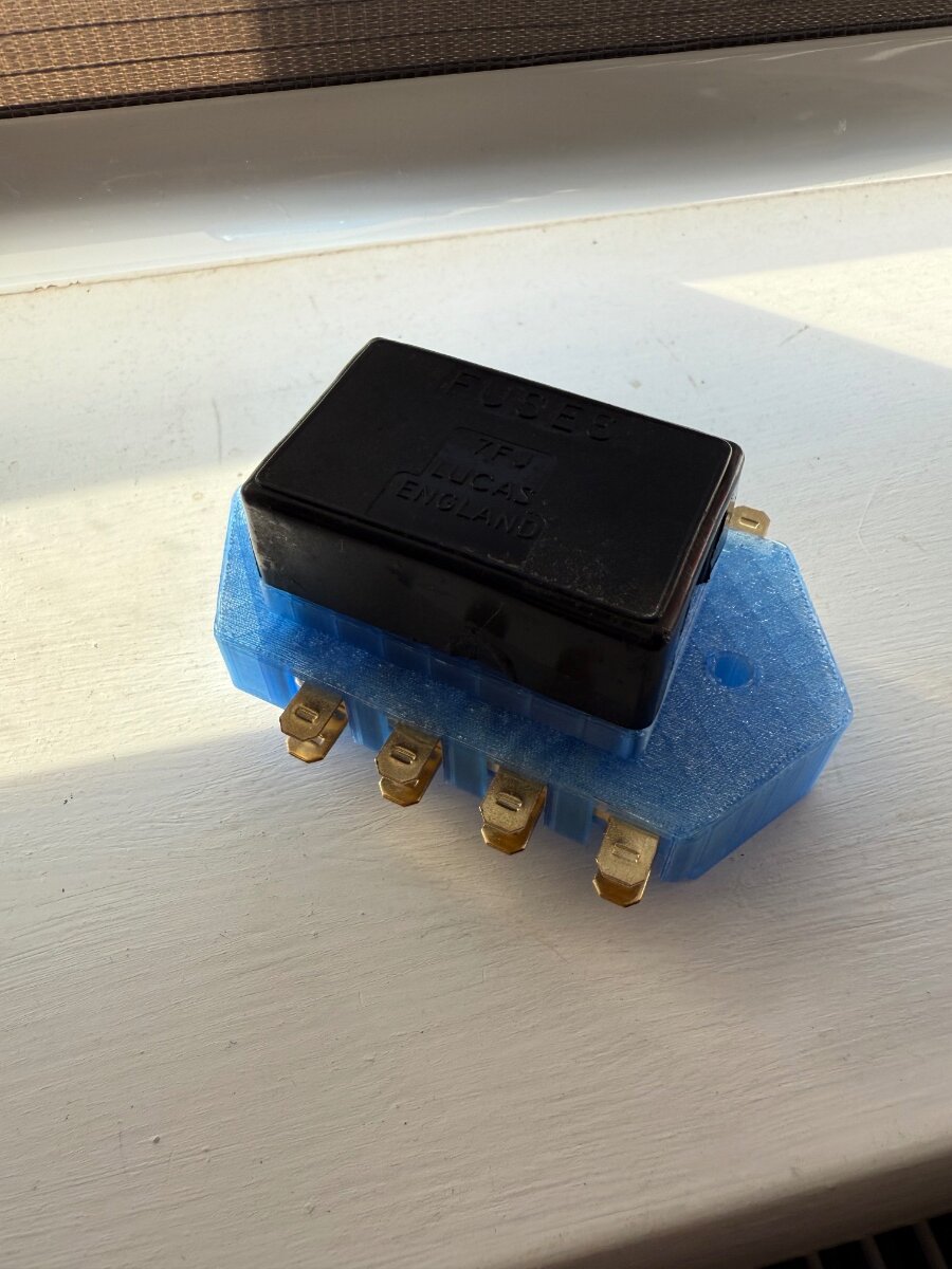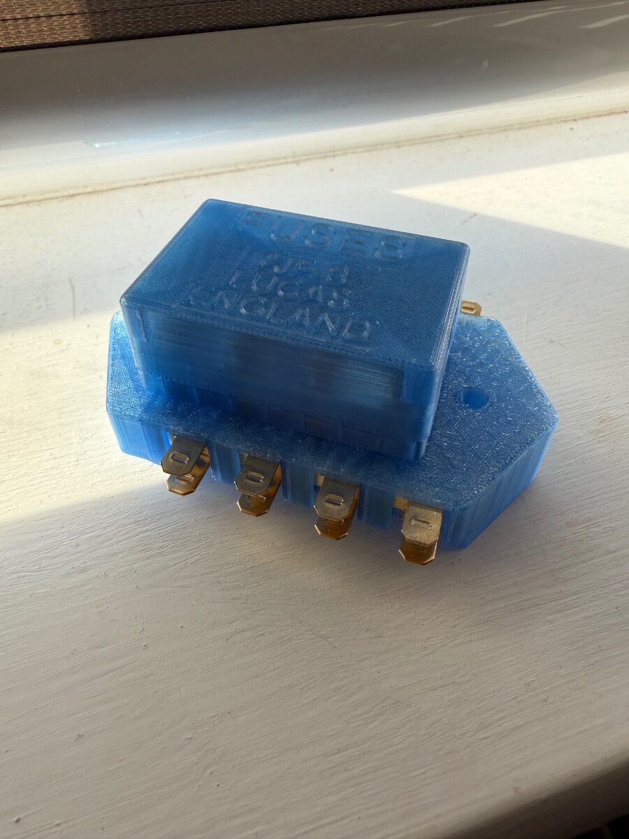 GreatOldOne Posted September 3, 2025 Report Posted September 3, 2025 So I’ve been busy in Fusion, and come up with this using readily available parts: Ignore the blue plastic; that’s just what I have loaded in the printer. Once finalised it’ll be black ABS or something similar. Is it a one to one, exact copy of the original Lucas? No, but it looks like it, and all the important dimensions (fixing points etc) are correct. I’m toying with the idea of adding LED ‘fuse blown’ indicators, if I can work out how they work. And I’ll also do a lid for it, as the original won’t fit currently due to the stem. All in its about 5mm bigger in all directions bar height, where it’s only a couple of mm higher. Once everything is done I’ll publish the files on Printables. The fuse holders a quid or so each, and the twin adaptors are again not much for a bag of 20 or so. Cheers Jason Quote
