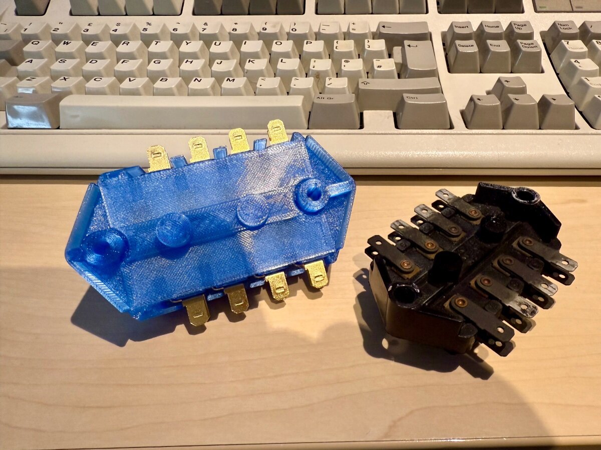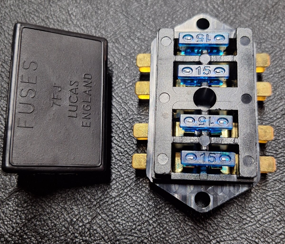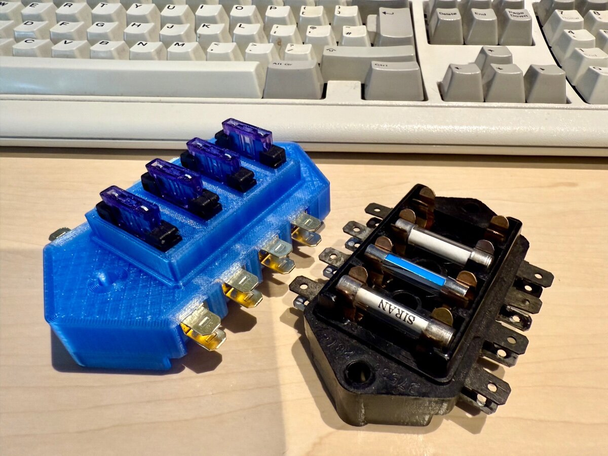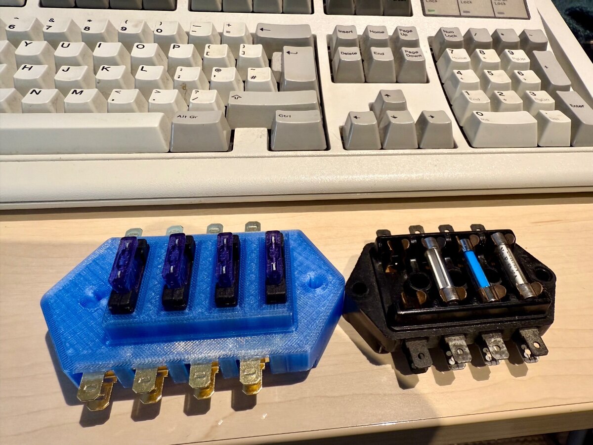 GreatOldOne Posted September 3, 2025 Report Posted September 3, 2025 So I’ve been busy in Fusion, and come up with this using readily available parts: Ignore the blue plastic; that’s just what I have loaded in the printer. Once finalised it’ll be black ABS or something similar. Is it a one to one, exact copy of the original Lucas? No, but it looks like it, and all the important dimensions (fixing points etc) are correct. I’m toying with the idea of adding LED ‘fuse blown’ indicators, if I can work out how they work. And I’ll also do a lid for it, as the original won’t fit currently due to the stem. All in its about 5mm bigger in all directions bar height, where it’s only a couple of mm higher. Once everything is done I’ll publish the files on Printables. The fuse holders a quid or so each, and the twin adaptors are again not much for a bag of 20 or so. Cheers Jason Quote