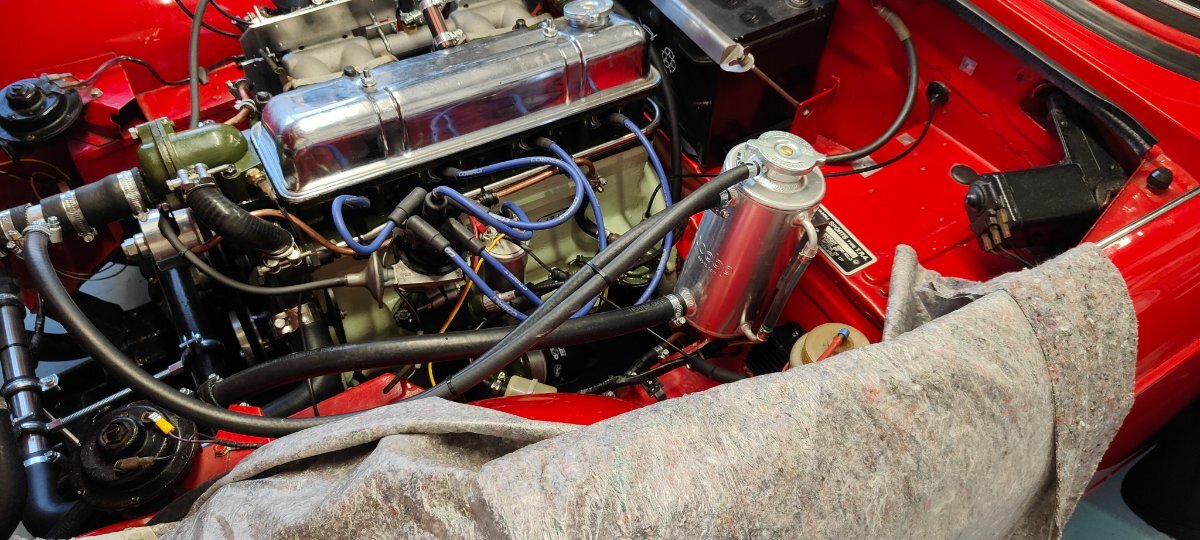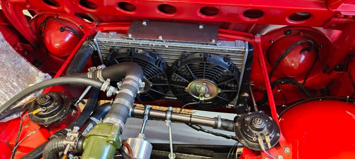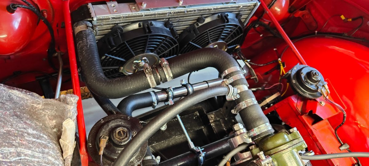 Andy Lowe Posted January 2 Report Posted January 2 Hello All. Can't find the original thread, however it may not have been on this forum. Thought I would share my modified cooling system arrangement with anyone interested. I know the subject has been covered extensively but on following all advice and finding my TR4 system fully serviceable, it still got very hot under certain conditions, so I decided to modify it using a generic modern radiator mounted at the front of the car and with a header tank and two stage electric cooling fans. I can report that it never goes anywhere above the middle of the temp dial in all operating conditions and the stage 1 fan only comes on after a a good run and then coming to a standstill for more that a minute or so. The 2nd stage fan has never come on. I appreciate that those who like to keep their vehicles as original will not be at all impressed and I understand that completely. Hope this is of use to someone. Kind regards..... Andy Quote