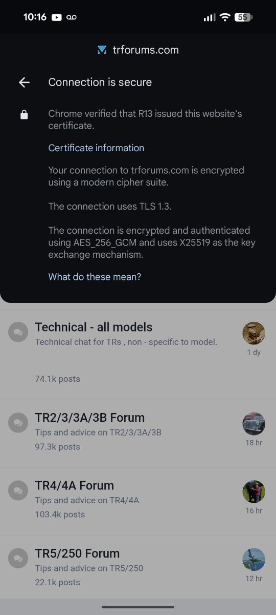 john.r.davies Posted January 24 Report Posted January 24 My phone accesses the TRR Forum, but with a crossed red dot alongside the URL Tapping that gets a page from Google Chrome saying that "You should not enter any sensitive informaton on this site (for instance passwords or credit card details) because it could be stolen by attackers" Google offers more details. I'm not going to enter my banking details here anyway, but should we be concerned? John Quote