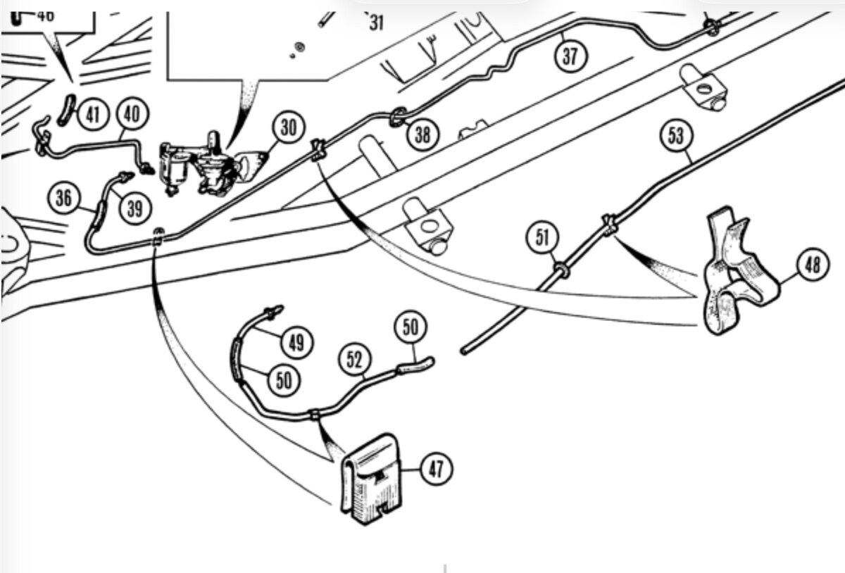 PaulAnderson Posted April 9 Report Posted April 9 As a related matter, I noted yesterday that the fuel line on my TR4A seems to vibrate where it rises from the chassis under the bonnet, heading to the fuel pump. I have a stainless flexi pipe to the petrol pump but the hard line before that seems to have more movement on it than I remember and I’m worried it may vibrate against the sharp edge of the chassis. Should there be a final clip there to the chassis? My old moss catalogue shows item 47, part number 130882, CLIP, pipe to hose bracket but I’m not certain if that’s it or how it’s fixed. Could anyone clarify this please. Quote